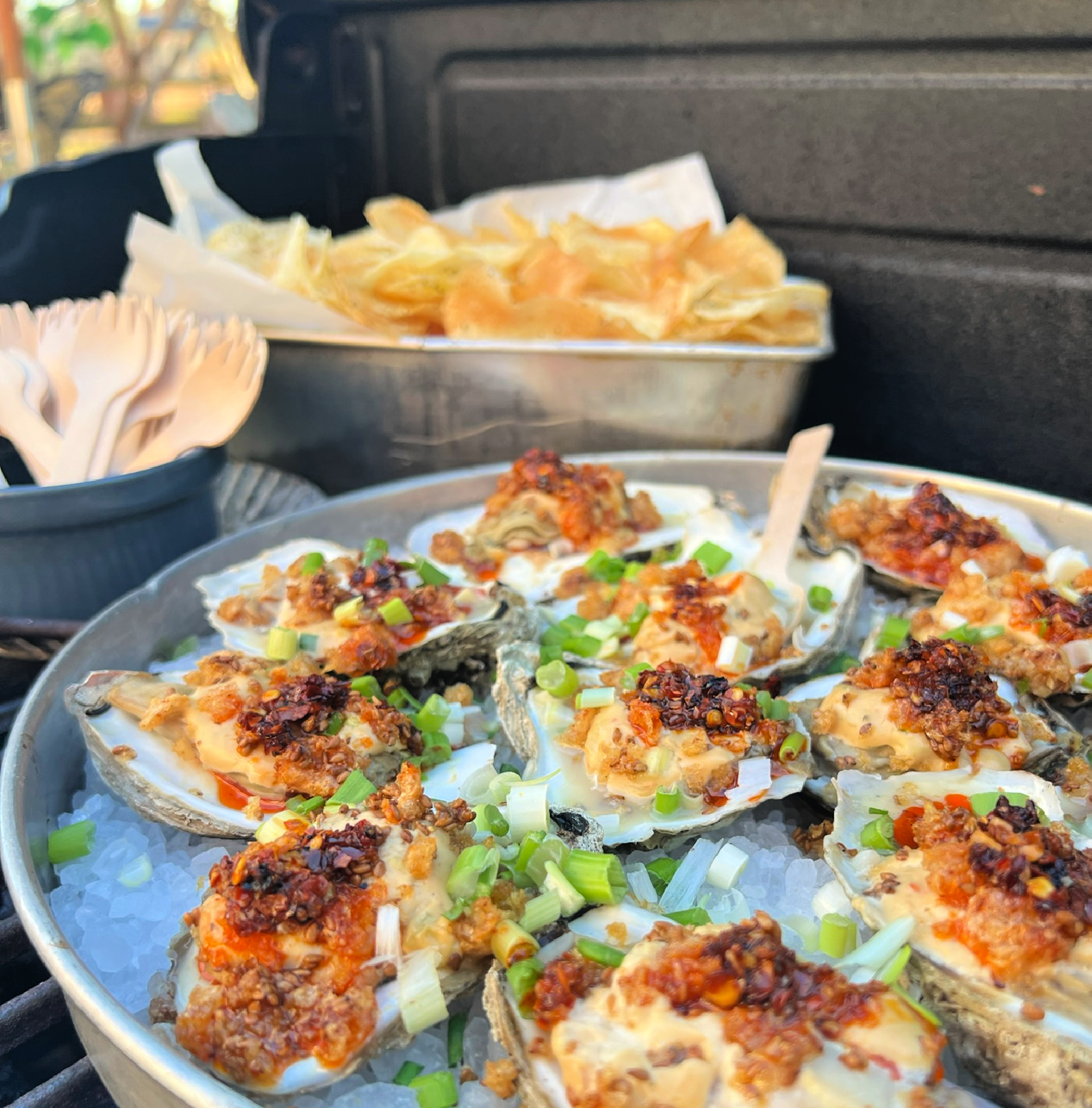 - Grill oysters with lid closed over high heat for 6–8 minutes until topping melts and crumbs are golden.Garnish with remaining onion and top with a bit of chili crisp. Serve while warm.