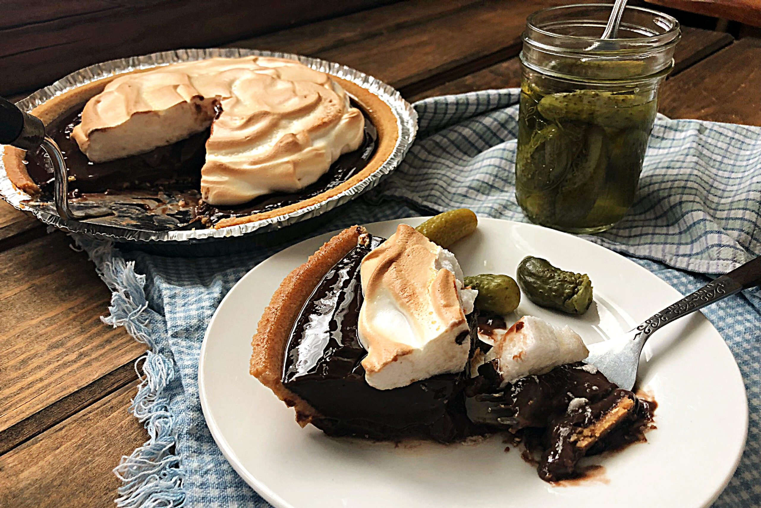 I have NO idea where the notion of having dill pickles along with a slice of chocolate pie came from as I’ve asked lots of folks, none who have ever heard tell of such. But if there was chocolate pie on the table, there was also a jar of little dill pickles… cute little midgets I believe. It must have been a “Menia thing” but I do declare, the tangy saltiness of the pickles does taste right good with the rich chocolate.